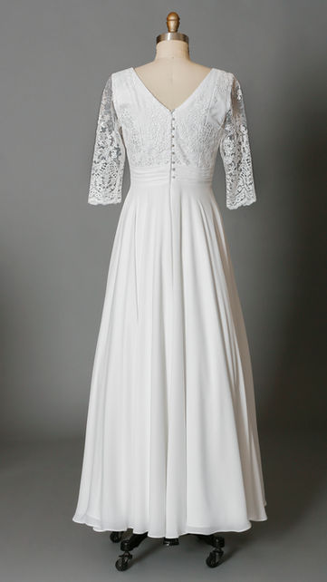 Robe au haut Duchesse Sexy en dentelle avec manches 3/4 et bas circulaire en mousseline. Petite ceinture froncée à la taille et boutons au dos.